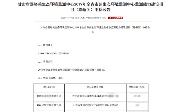2020年11月19日,甘肅省嘉峪關(guān)生態(tài)環(huán)境監(jiān)測中心2019年全省市州生態(tài)環(huán)境監(jiān)測中心監(jiān)測能力建設(shè)項目(嘉峪關(guān))中標(biāo)公示,其中項目編號:SSGH-JYGHJ-20-01/02/03/04,中標(biāo)供應(yīng)商:青島環(huán)控設(shè)備有限公司,中標(biāo)第三包。